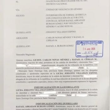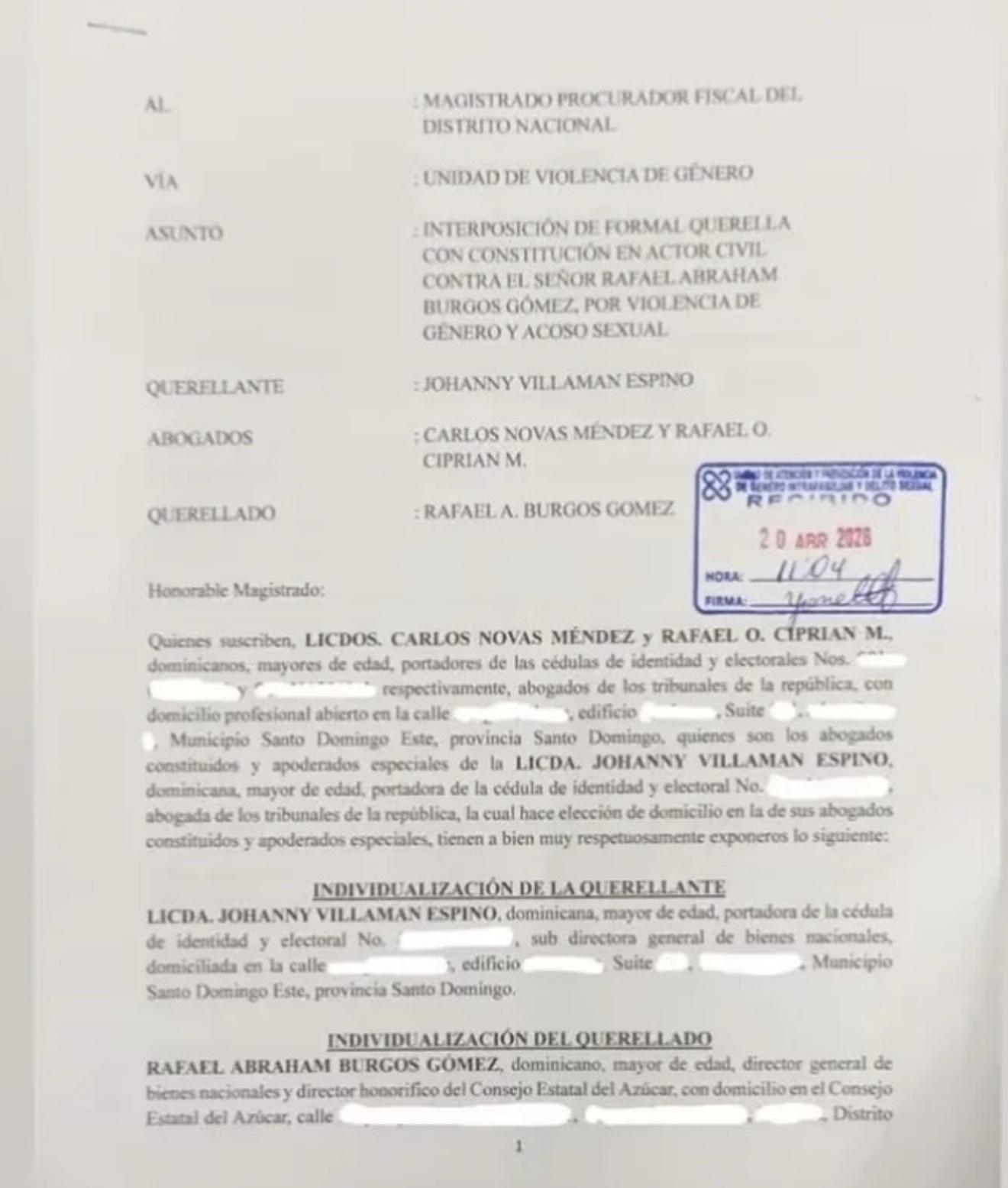 SANTO DOMINGO. La subdirectora ejecutiva del Consejo Estatal del Azúcar (CEA), Johanny Villamán, interpuso una demanda formal por presunto acoso sexual contra el director general de Bienes Nacionales y también titular del CEA, Rafael A. Burgos Gómez, según informaciones preliminares.